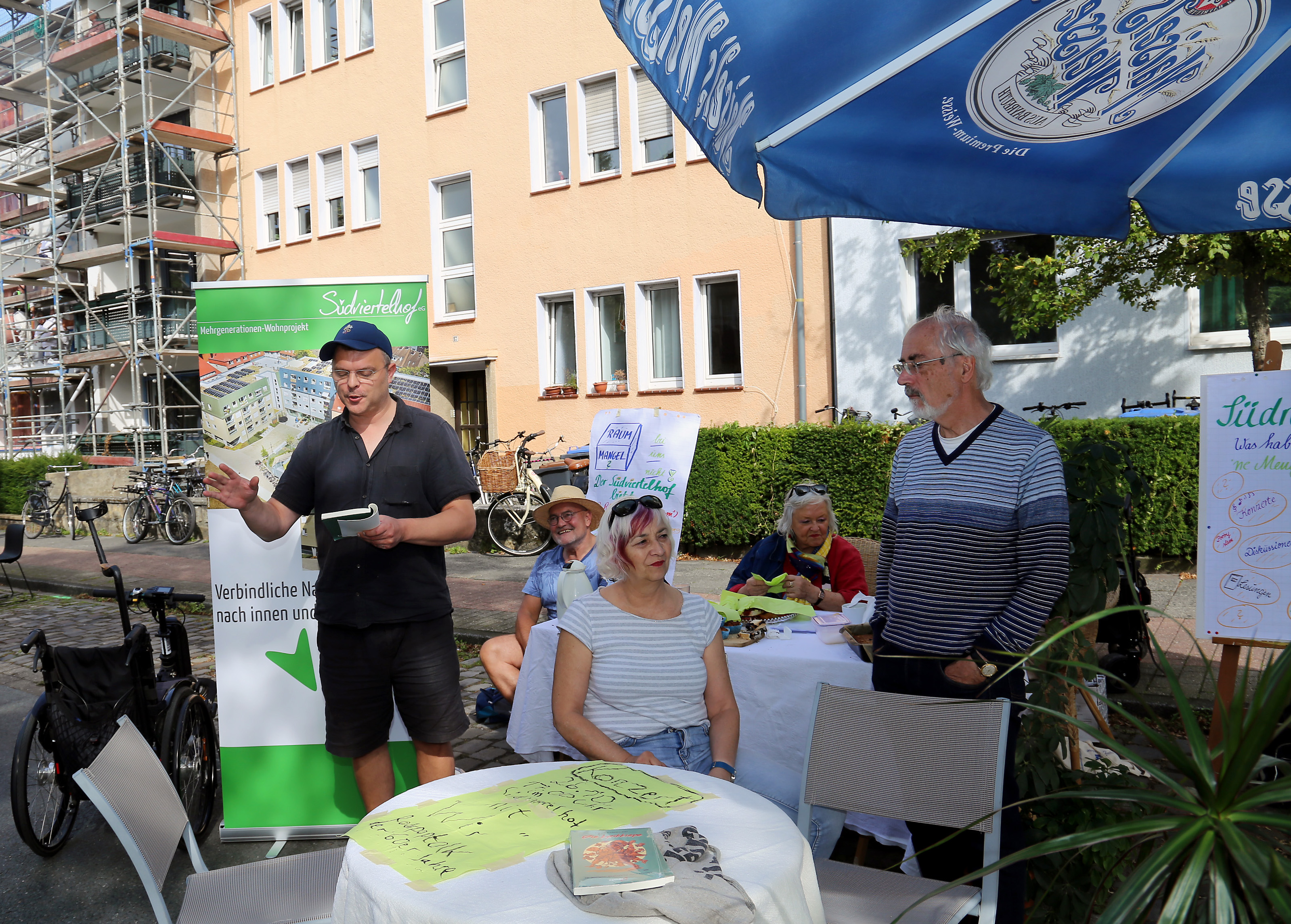 Bei Kaffee und Kuchen nutzten viele Besucherinnen und Besucher die Möglichkeit, sich über den Gebäudekomplex an der Hermannstraße zu informieren und Fragen der Nachhaltigkeit zu diskutieren. Schauspieler und Autor Tilman Rademacher, ebenfalls Bewohner des Südviertelhofs, trug aus seinem Buch „Die Lyrikkiepe“ vor. Sprachlich hintersinnig und witzig schilderte er zum Beispiel in einem Gedicht, was passiert, wenn David auf Goliath – sprich Fahrradfahrer auf Autofahrer trifft. Und auch die Kinder des Südviertelhofs waren an diesem Tag mit Feuereifer dabei: Sie hatten einen Wunschbaum gestaltet, an den alle, die wollten, auf Karten ihre ganz persönlichen Vorstellungen über eine autofreie Stadt notieren und an den Baum hängen konnten. Und da kamen viele Ideen zusammen. Fazit des Vorbereitungsteams: Ein gelungener Tag, der hoffentlich auch einigen politischen Entscheidungsträgern der Stadt Anregungen für eine echte Mobilitätswende gegeben hat.