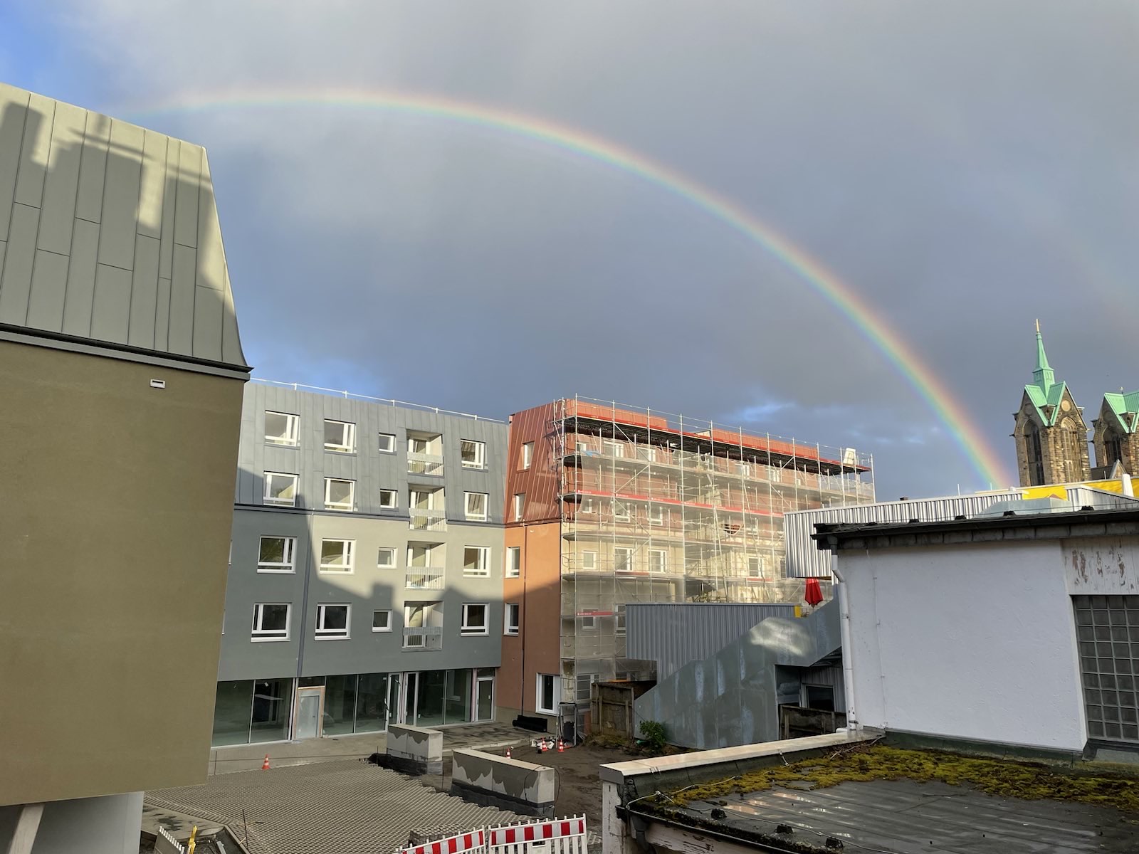 Das muss ein gutes Omen sein: Wie ein Schutzschirm umschließt dieser Regenbogen den Südviertelhof. Und so bunt, wie er sich zeigt, ist auch die Gemeinschaft, die der neue Wohnkomplex an der Hermannstraße demnächst beherbergen wird. Ab Mitte Juli werden die ersten Genoss*innen in ihr neues Domizil einziehen. Die letzten Vorbereitungen an der Baustelle laufen auf Hochtouren.